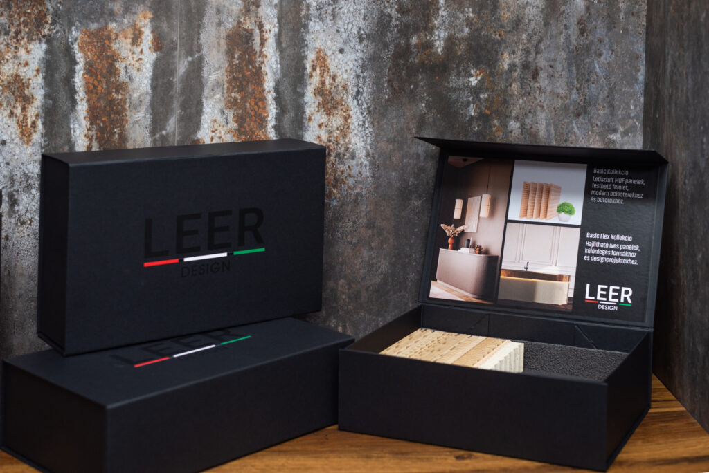 A LEER Design mintadoboza azért készült, hogy a tervezők, kivitelezők és vásárlók kézben tartható, valós anyagminták alapján dönthessenek a megfelelő felület és marásminta kiválasztásáról. A mintadoboz minden fontos kollekciónkból tartalmaz reprezentatív elemeket, így azonnal átláthatóvá válik a LEER termékek, textúrája és kínálata.