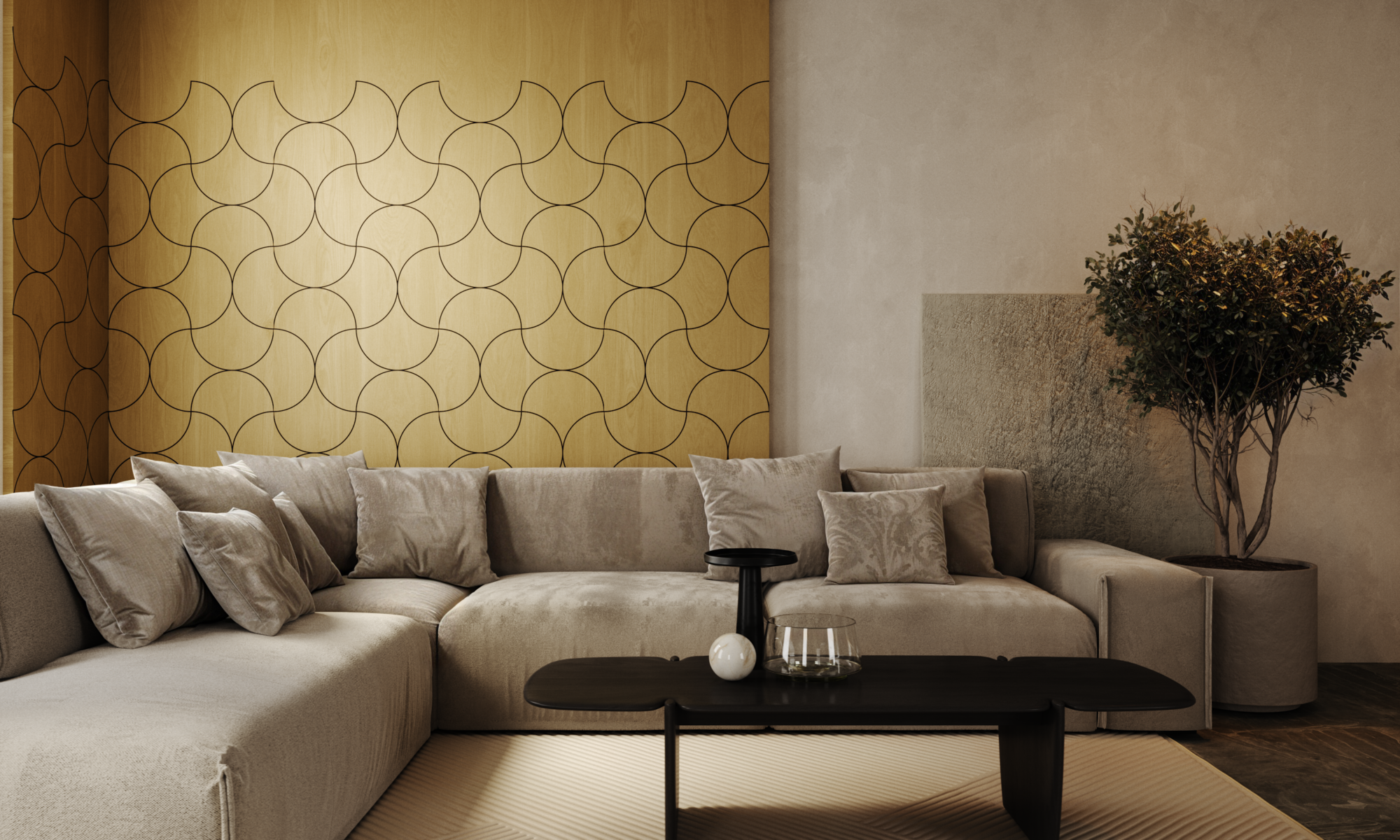 Az Diamu falpanel kifinomult, szimmetrikus mintája a természetes formák és a modern design találkozását jeleníti meg. A függőlegesen ismétlődő motívumok vizuális könnyedséget és ritmust adnak a térnek – mintha egy lágyan hullámzó mintázat bontakozna ki a falon.